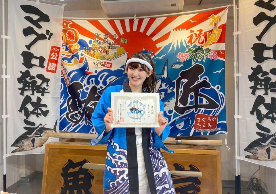 3 : 雑ニュー :2021/07/10(土) 11:02:32.70 ID:fTpyGG2p0「日本初」の称号を得たアイドルがいる。ハロー!プロジェクトの人気グループ・アンジュルムの川村文乃(22)だ。このほど、全国でわずか8人しかいないという超難関の「1級マグロ解体師」試験に合格したことが判明。日本で9人目、女性では初の免許取得者となった。