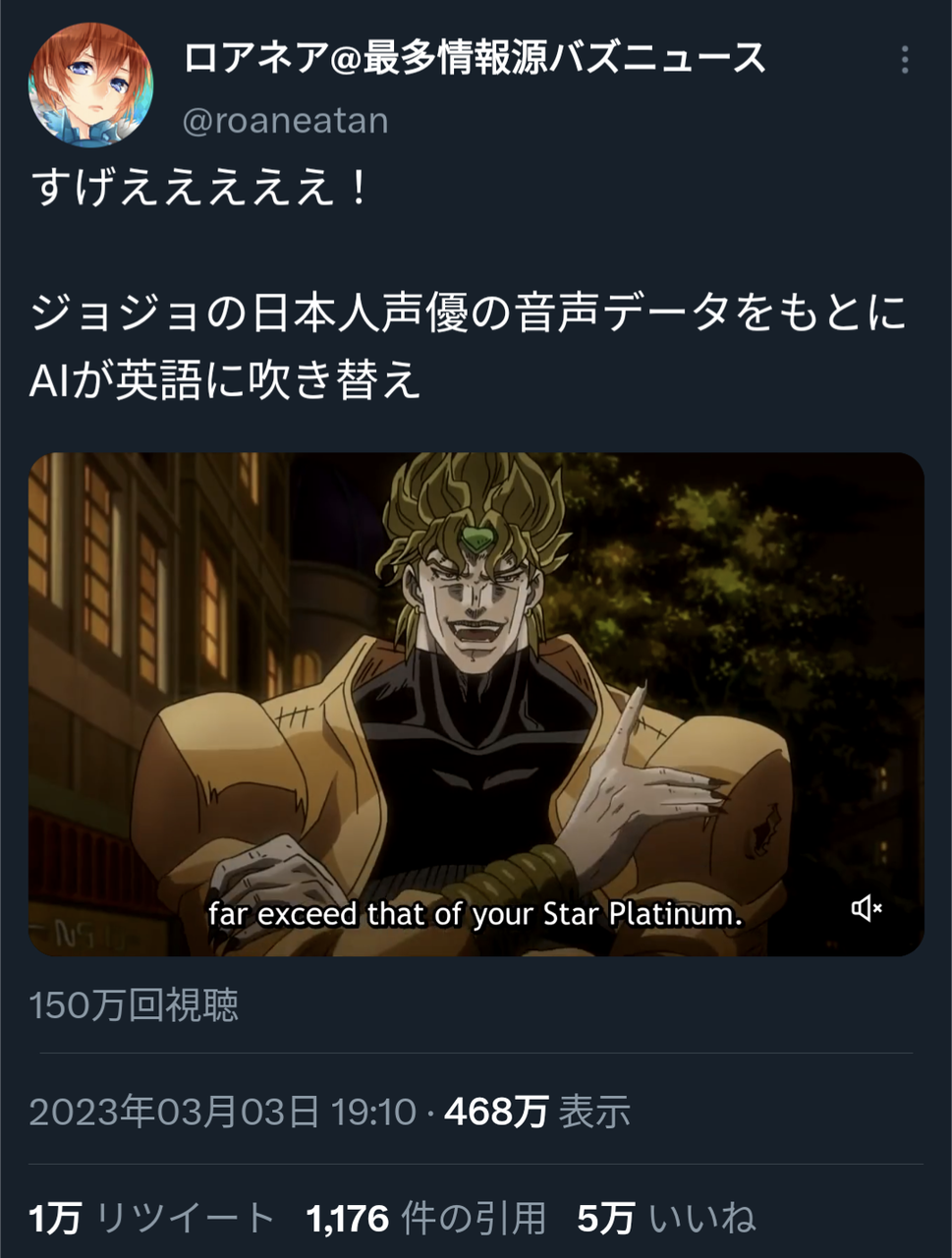 ジョジョの日本人声優の音声データをもとにAIが英語に吹き替え pic.twitter.com/xb9S7bZCOl
