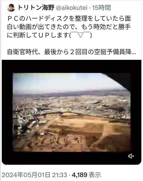 元空挺団隊員だったX民がヘリから降下の様子を自前のメガネ型カメラで撮影した動画を公開