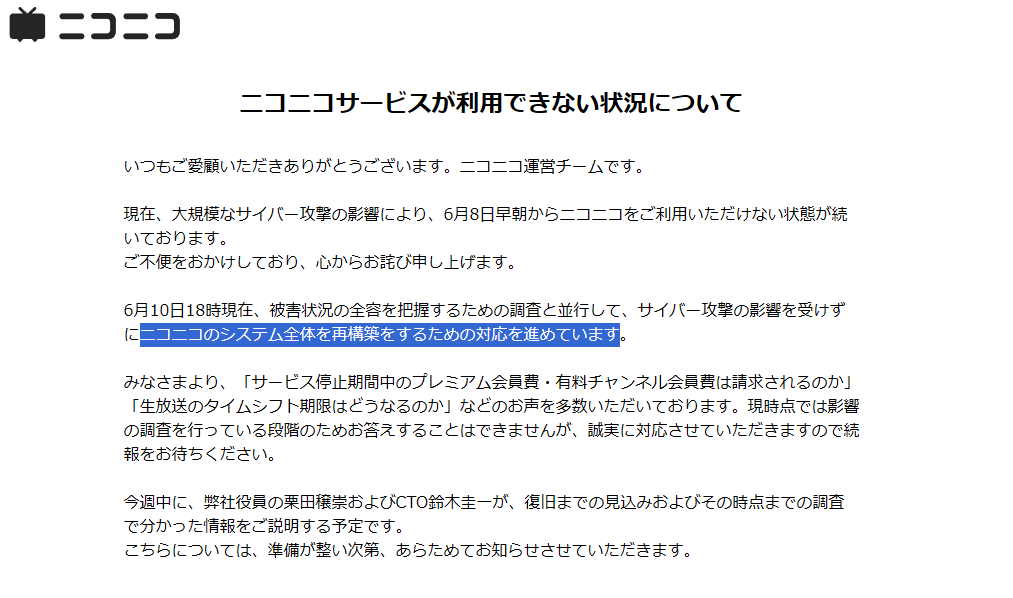 さっきN高のHP見たときにKADOKAWAグループの複数のウェブサイトにおける障害って書いてたからたまたまニコニコが大打撃食らっただけでニコニコの他に取りたかったり潰したかったものでもあったのかもしれない