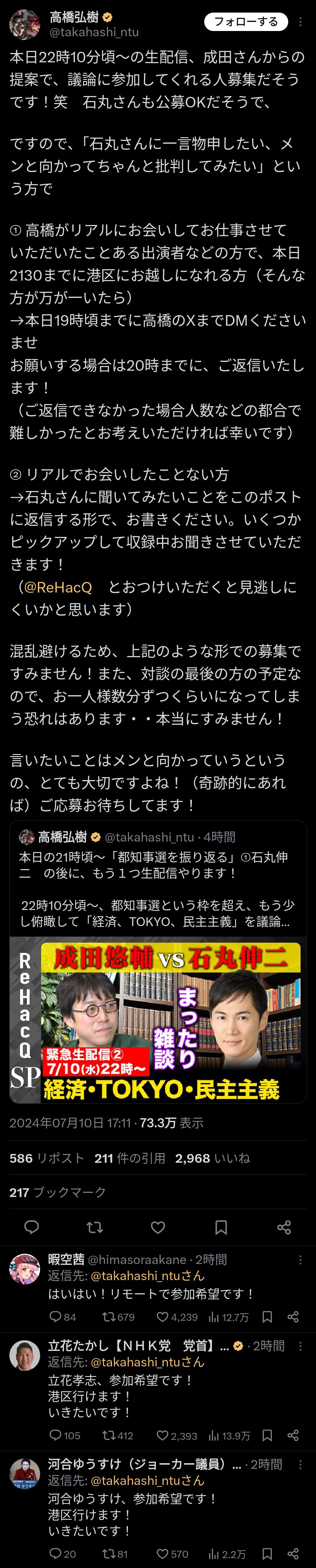 暇さんより石丸とか成田の方が命狙われてる度高いやろ