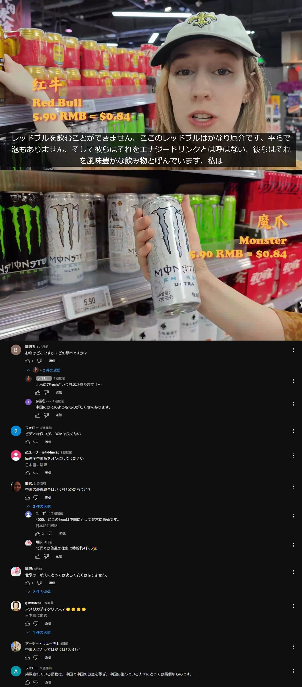 コメント欄を見るとここは中国の高級スーパー(日本人からすると安く思えるが)、北京の時給が4ドル(約640円)みたいなことも書いてあります