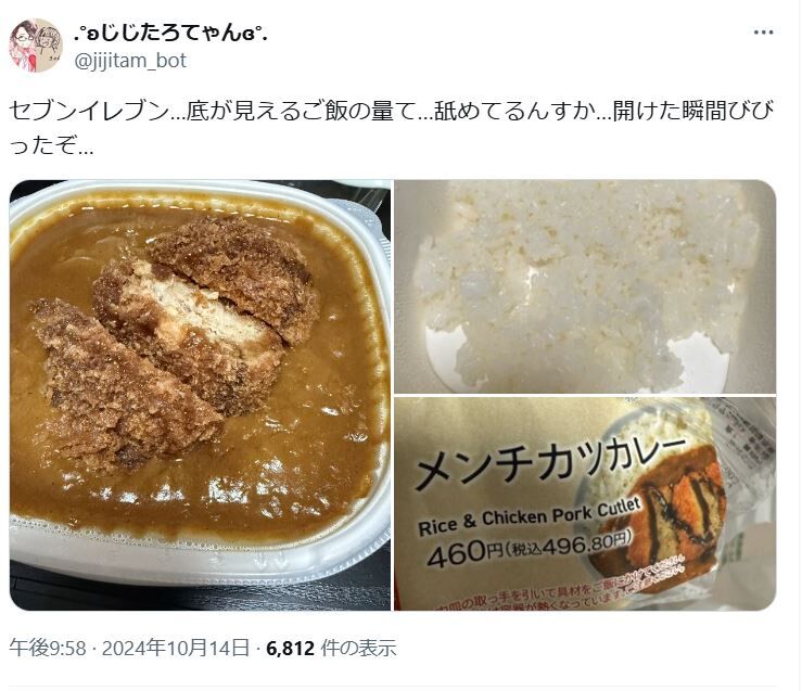セブンイレブン…底が見えるご飯の量て…舐めてるんすか…開けた瞬間びびったぞ… pic.twitter.com/zuUBMm4K71