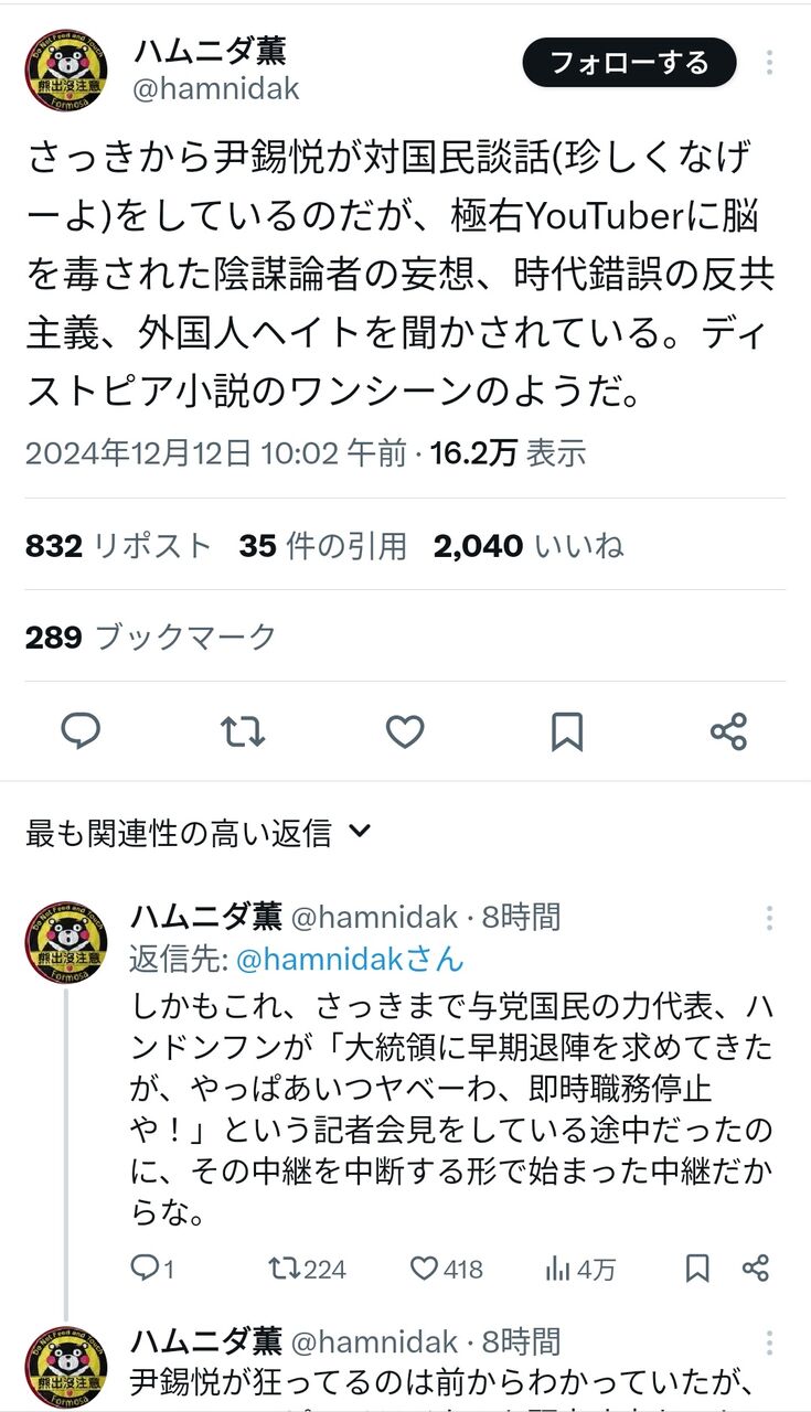 私は今日、非常戒厳に関する立場を明らかにするためこの場に立ちました。