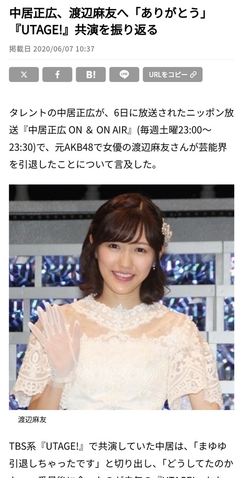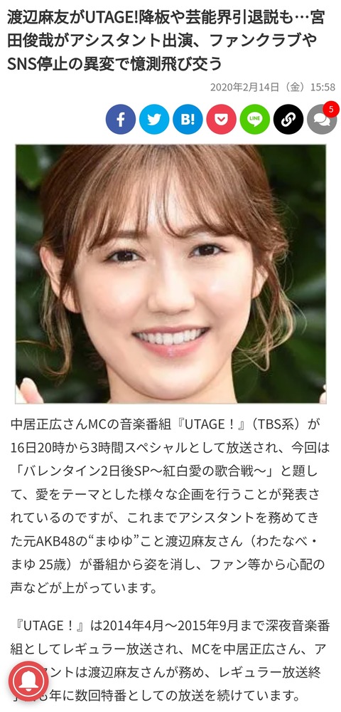 まゆゆこと渡辺麻友さんの引退理由ガチで謎。中居正広さんMC番組を突如体調不良で欠席した後に表舞台に姿を表さず引退
