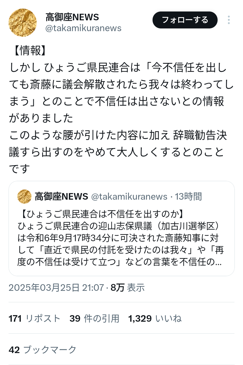しかし ひょうご県民連合は「今不信任を出しても斎藤に議会解散されたら我々は終わってしまう」とのことで不信任は出さないとの情報がありました