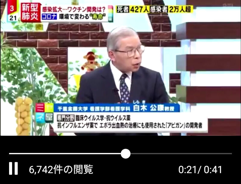 アビガン錠を開発した白木公康教授が、新型コロナウイルスに、アビガン錠が効くと仰っております。👍その時テレビ放送された動画が、消されています。是非、ショート動画を観てください。😙 pic.twitter.com/U2BflSqDjf